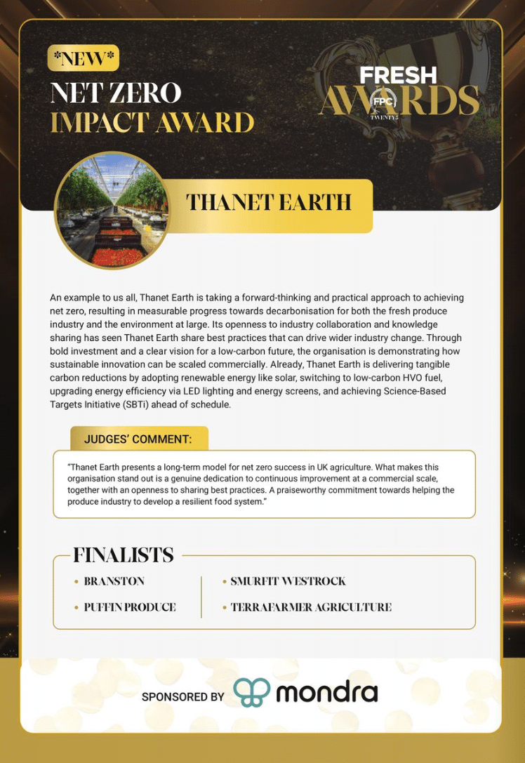 Thanet Earth wins Net Zero Impact Award at the FPC Fresh Awards