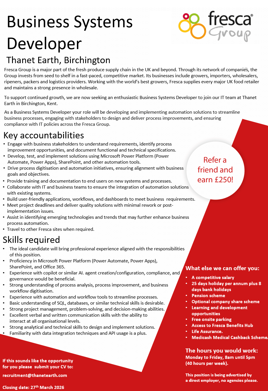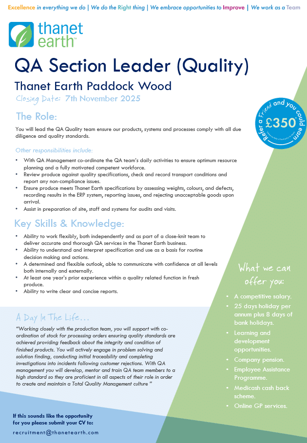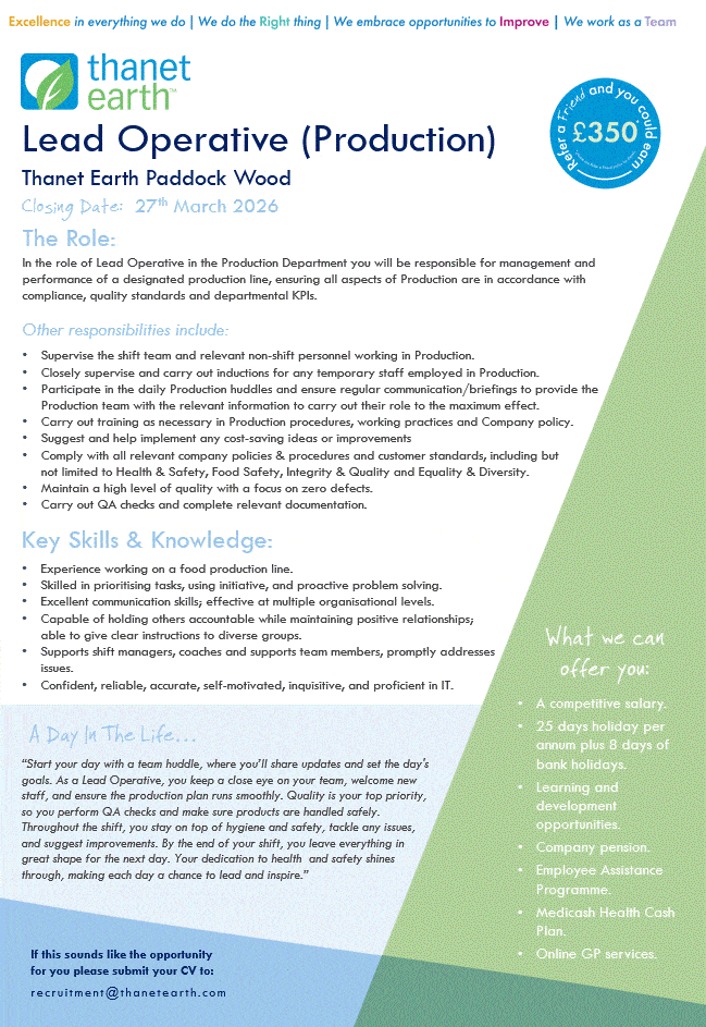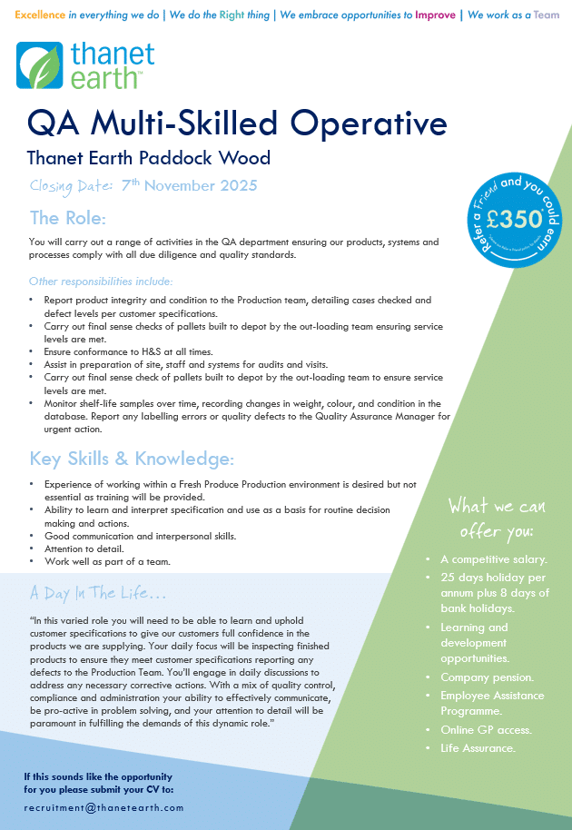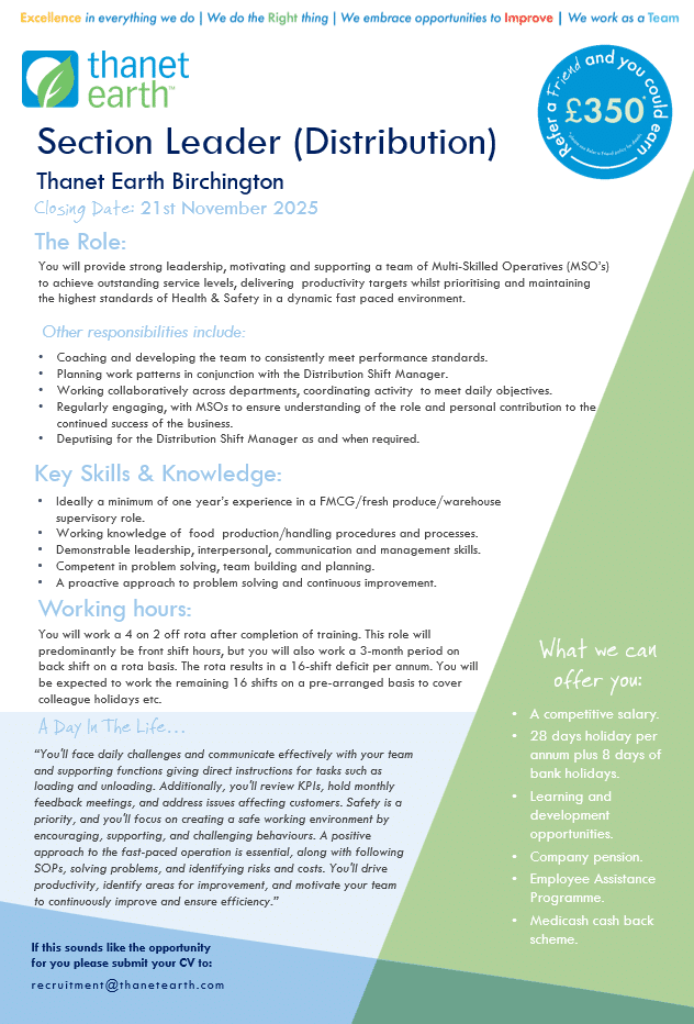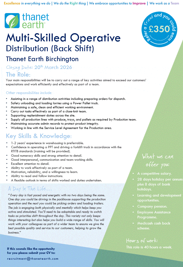 To apply please email recruitment@thanetearth.com